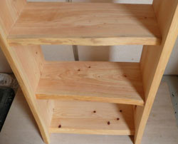 本棚側版は厚み30mm以上の耳付き桧板を使用。奥行きは側板で25〜33cm。棚板奥行25cm前後。巾50cm高さ120cm位。 無塗装。塗装可(植物性の自然塗料)サイズは、目安です。 右画像は、本棚裏面(壁側)は、壁に添うよう直線カットしました。 棚板はも木ねじで固定して、丸棒で化粧して、金属類は全く外からは、見えません。 |